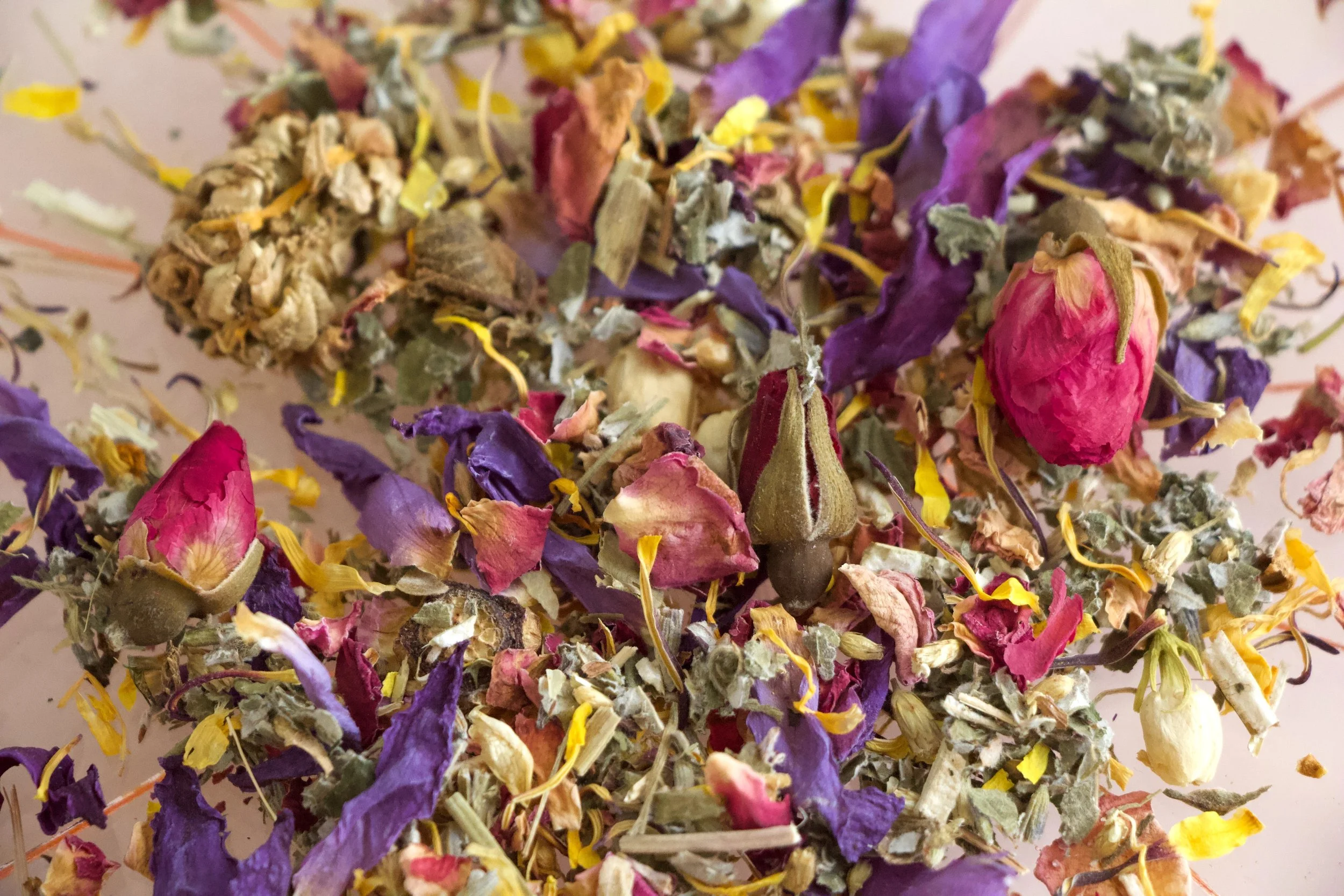 Red Raspberry Leaf (Rubus idaeus), Motherwort (Leonurus cardiaca), Calendula (Calendula officinalis), Yarrow (Achillea millefolium), Rose (Rosa rubiginosa), Lavender (Lavandula angustifolia), Jasmine (Jasminum), Blue Lotus Flower (Nymphaea caerulea)